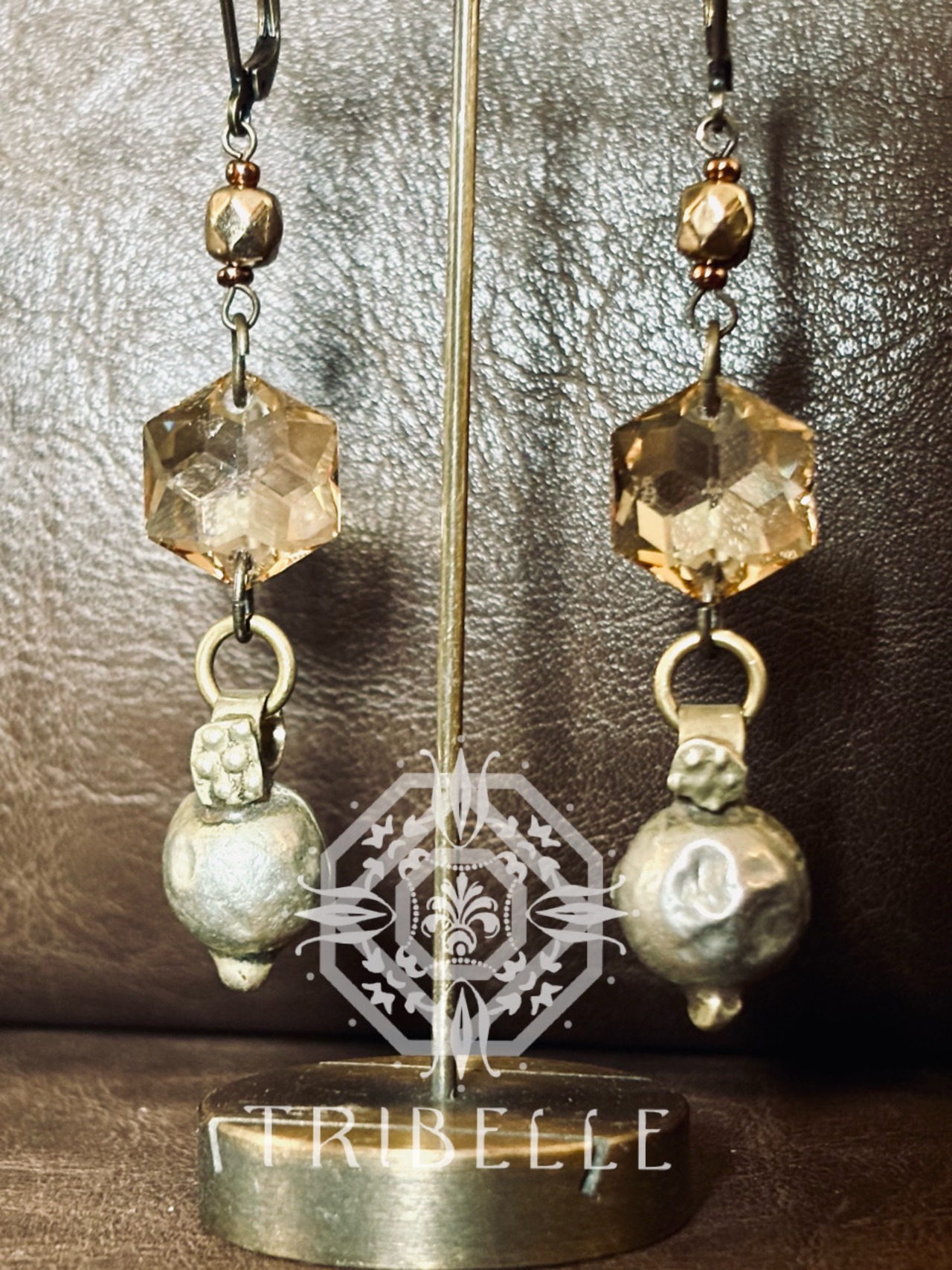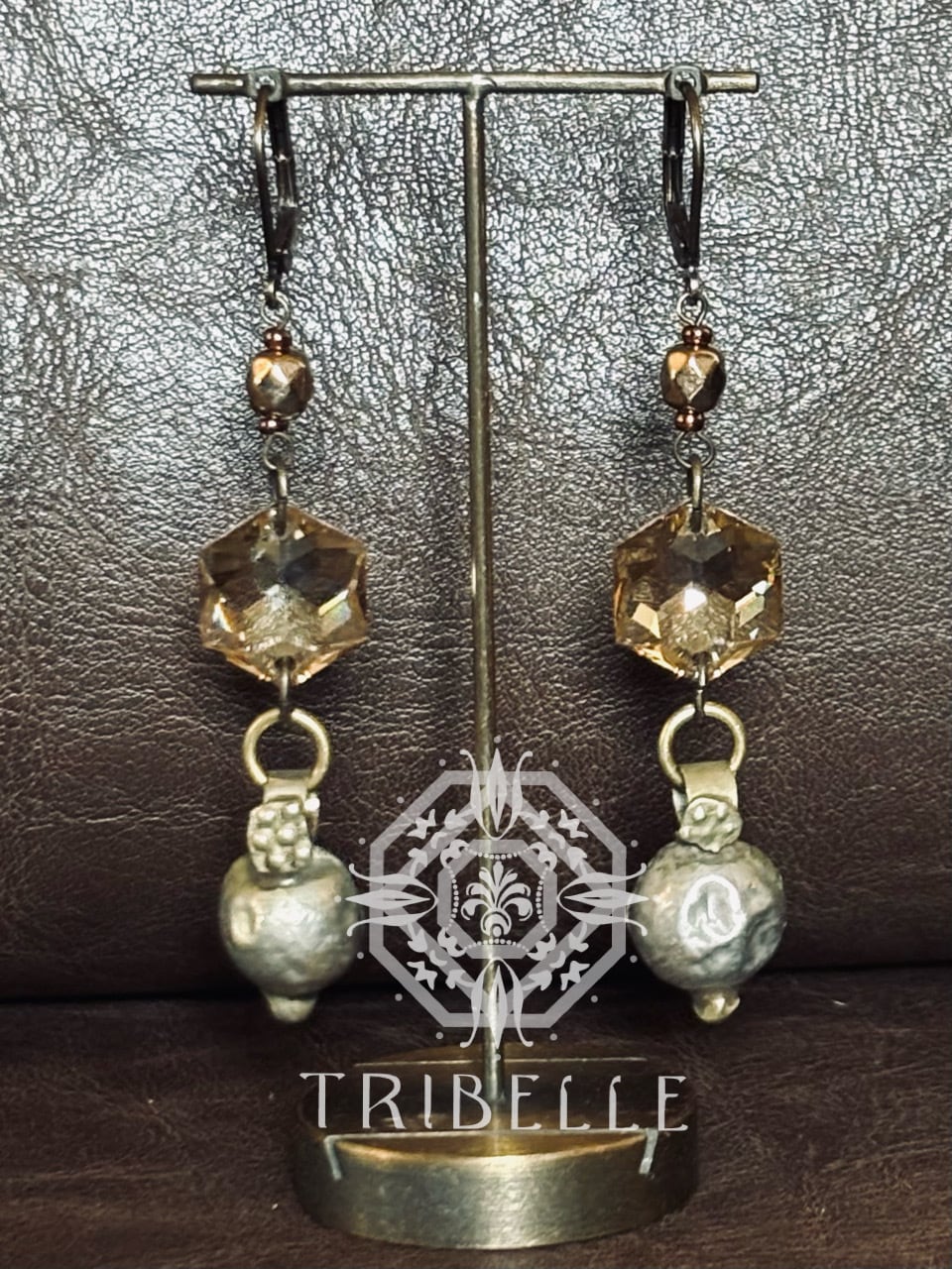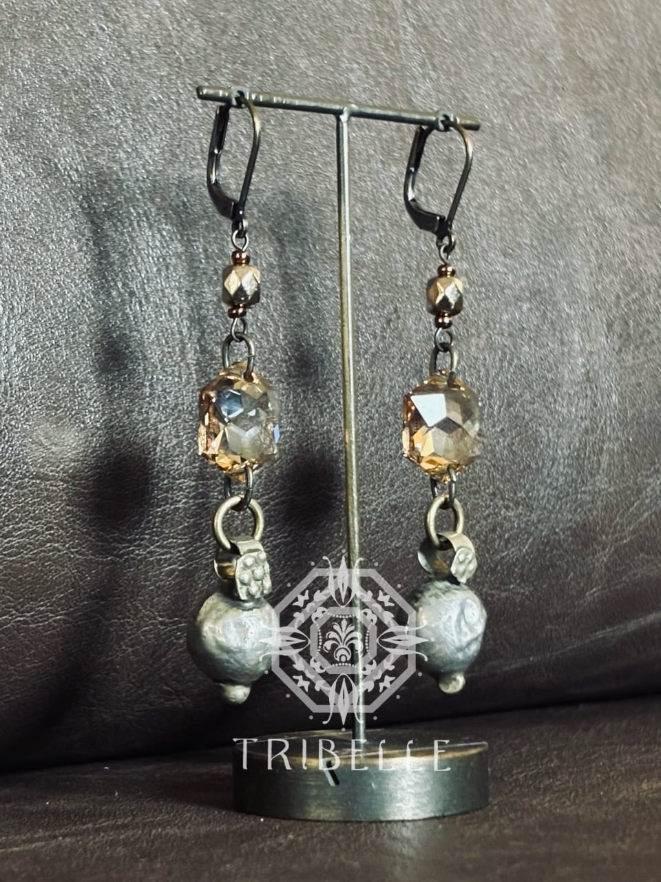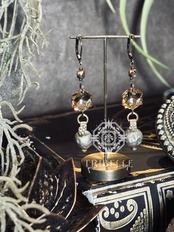 コロンと丸いベル型ビーズと、スワロフスキー社のクリスタルパーツを使用したピアス。
