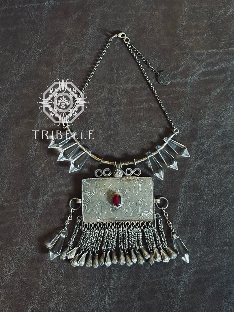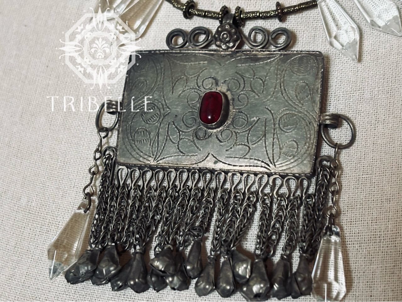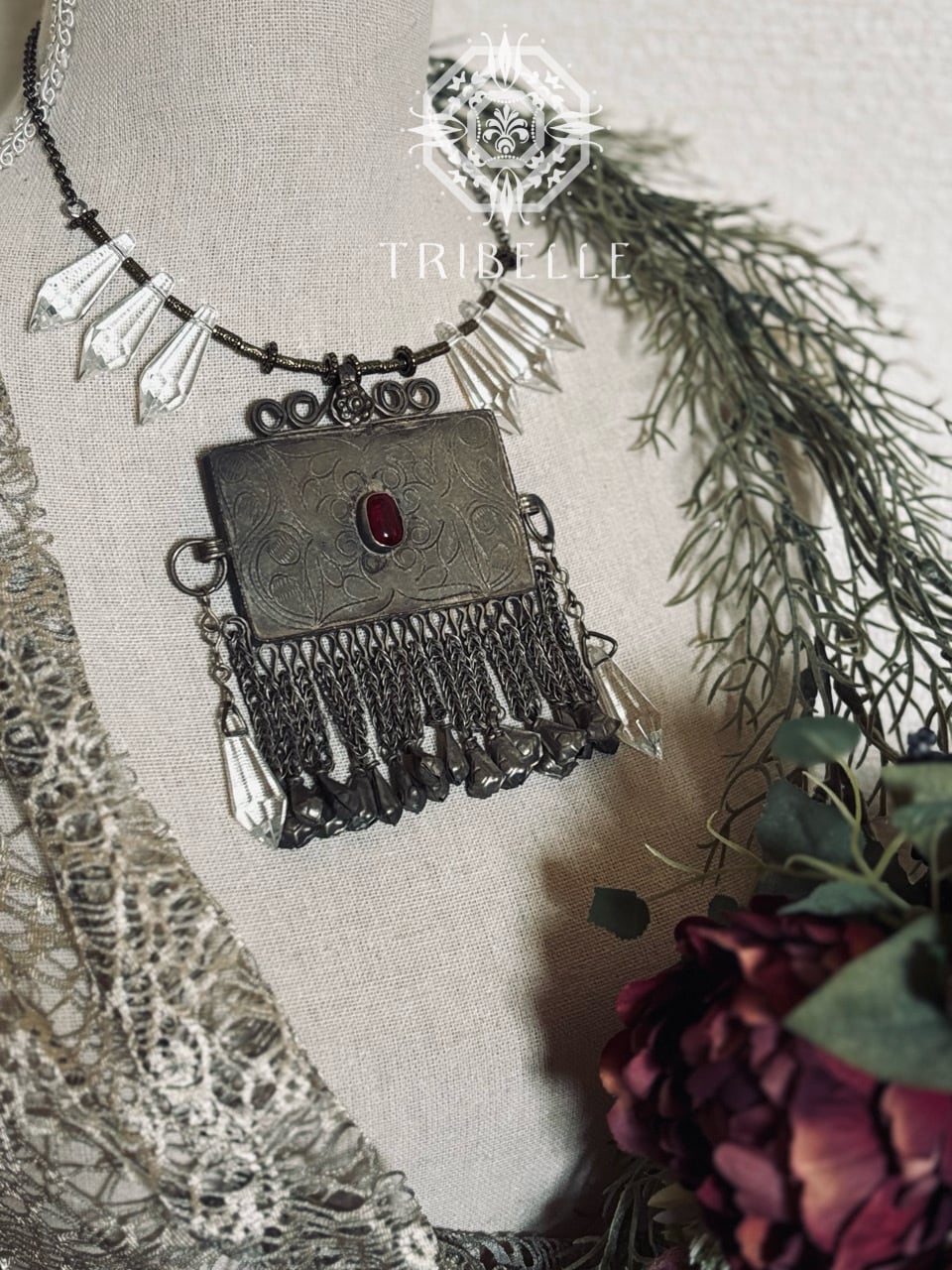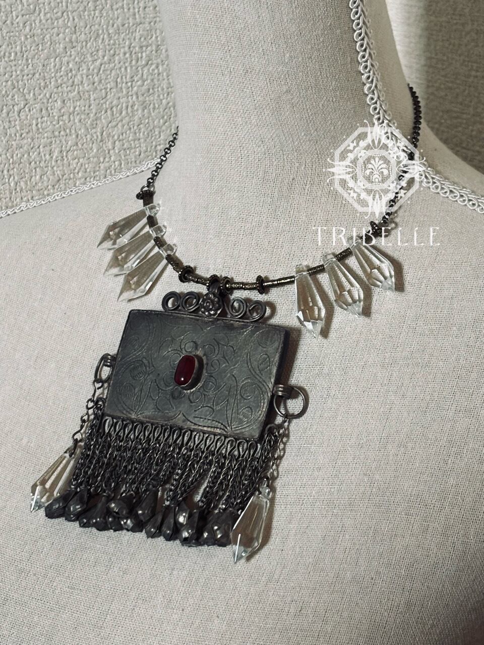 四角く大きいトライバルペンダントが特徴的なネックレスです。