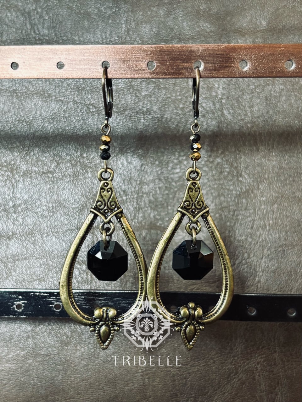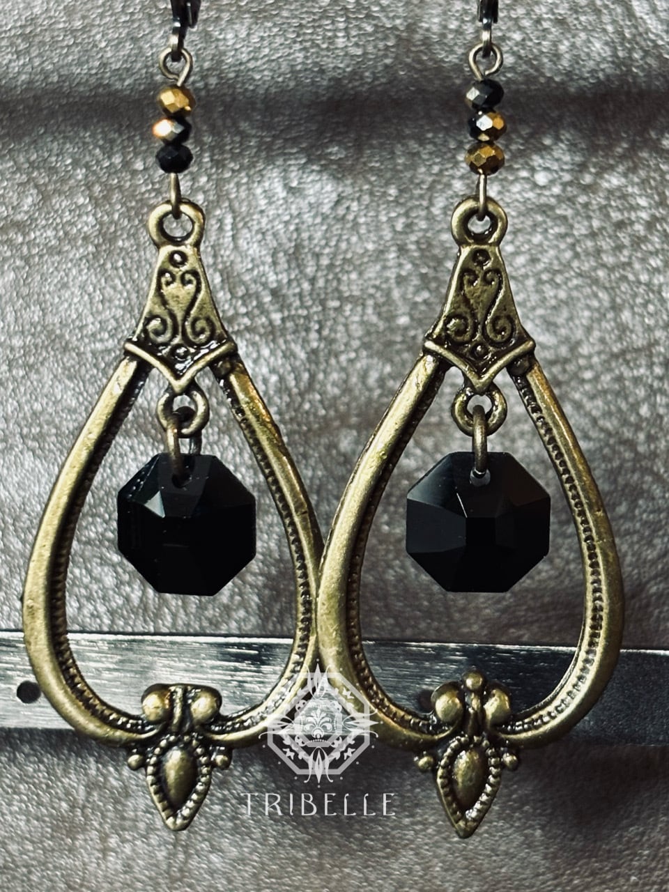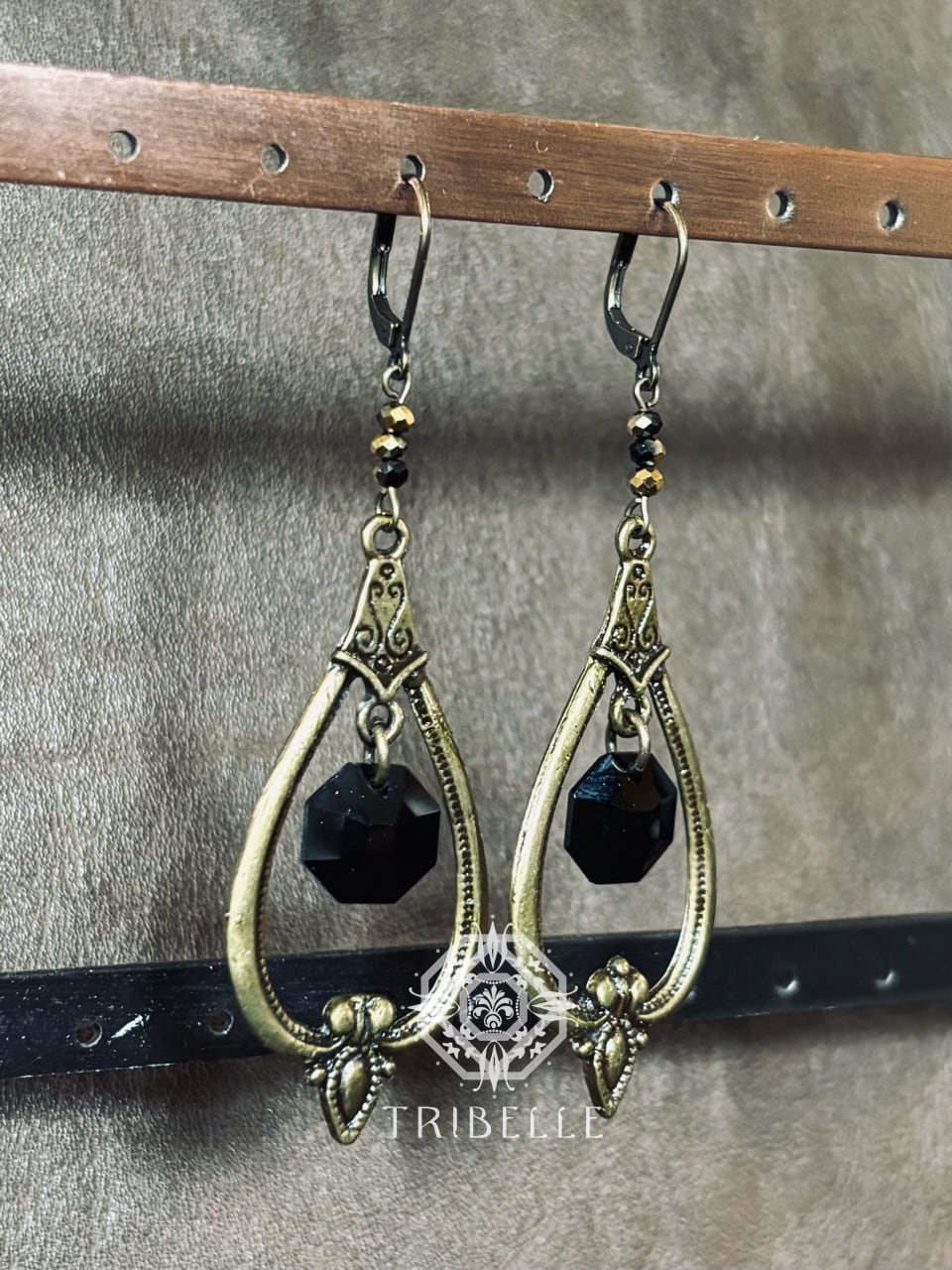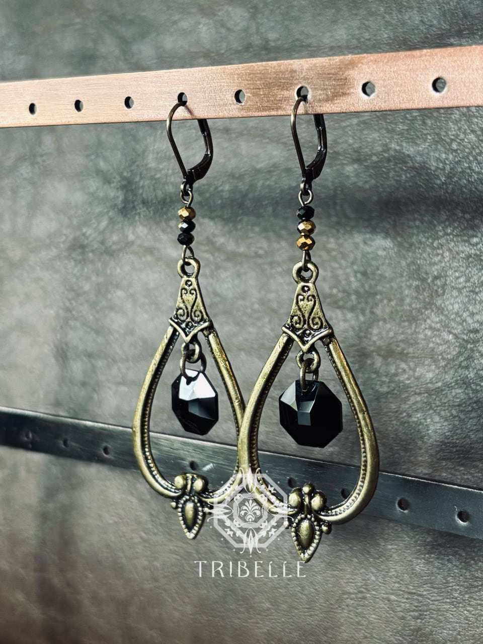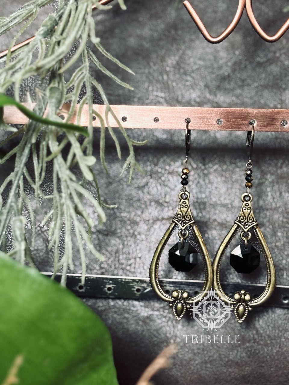 ティアドロップ型のフレームに、黒いスワロフスキーガラスが揺れるピアスです。